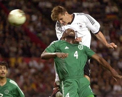 克洛泽的成名之战无疑是2002年世界杯中德国对阵沙特一役,在那场比赛中,德国队始终用高空轰炸的战术考验着沙特的防线,在身高差距对比明显的情况下德国的这一战术也非常奏效。在队友一次次的传中输送中,克洛泽也展现出了独一无二的头球进攻能力,随着一个头球帽子戏法和“克氏空翻”在世界杯赛场上的出现,24岁的克洛泽也就此走上传奇之路。
